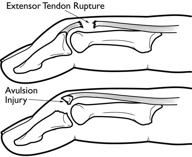 Mallet finger is an injury to the extensor tendon at the tip of the finger. It usually occurs when the fingertip is forcefully jammed or bent, such as when struck by a ball. This causes the tendon to tear or pull off the bone, resulting in an inability to actively straighten the tip of the finger.